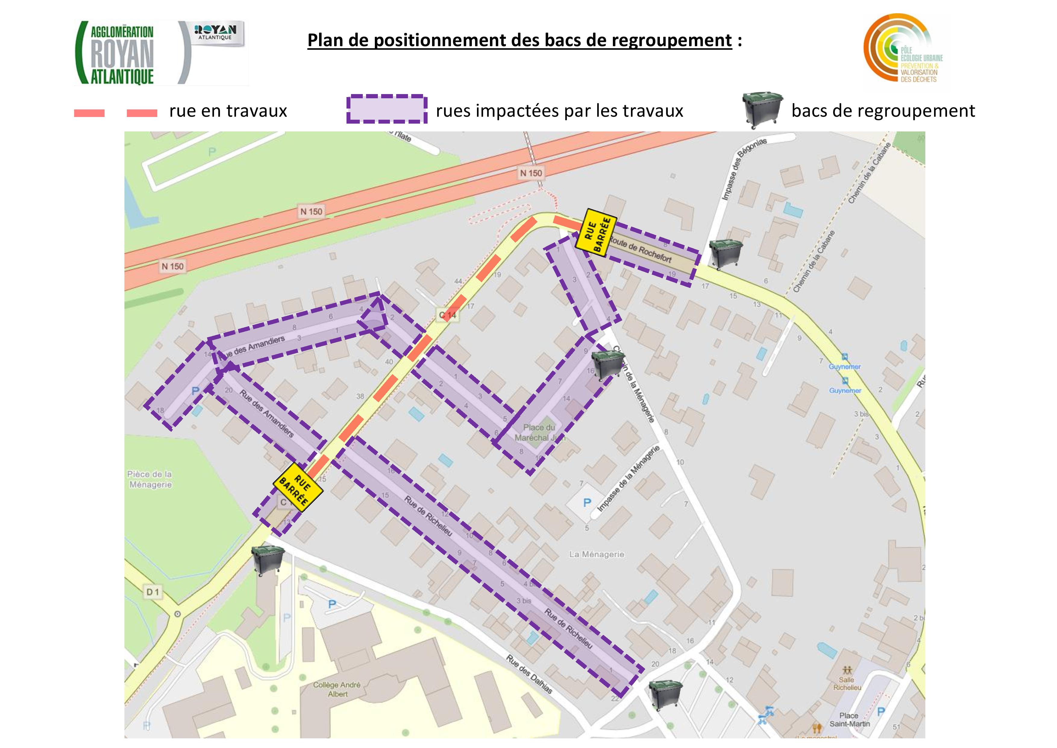 Collecte des déchets. Les riverains déposeront leurs ordures ménagères et sacs jaunes au carrefour route de Rochefort/impasse des Bégonias, au carrefour chemin de la Ménagerie/rue du Maréchal Juin, au carrefour rue des Dahlias/route des Écluses et sur la place Richelieu en vis-à-vis de la rue Richelieu.